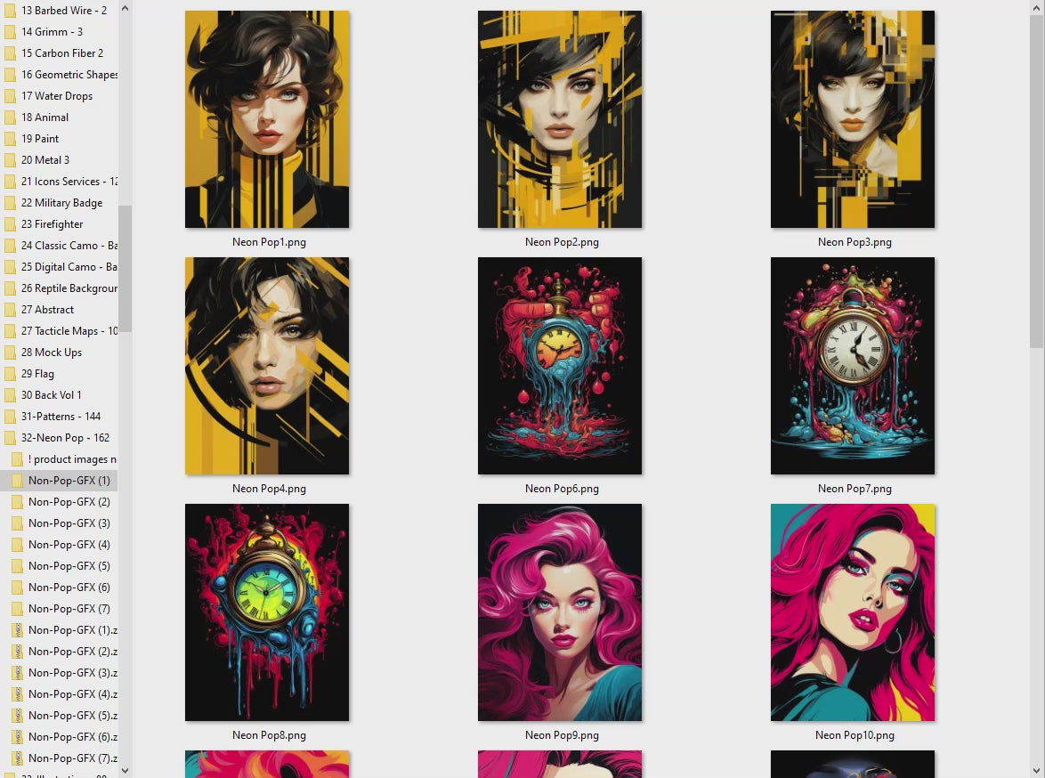 Add bold, modern flair to your designs with the Neo Pop GFX Image Pack—featuring 148 high-resolution graphics across 7 organized folders.